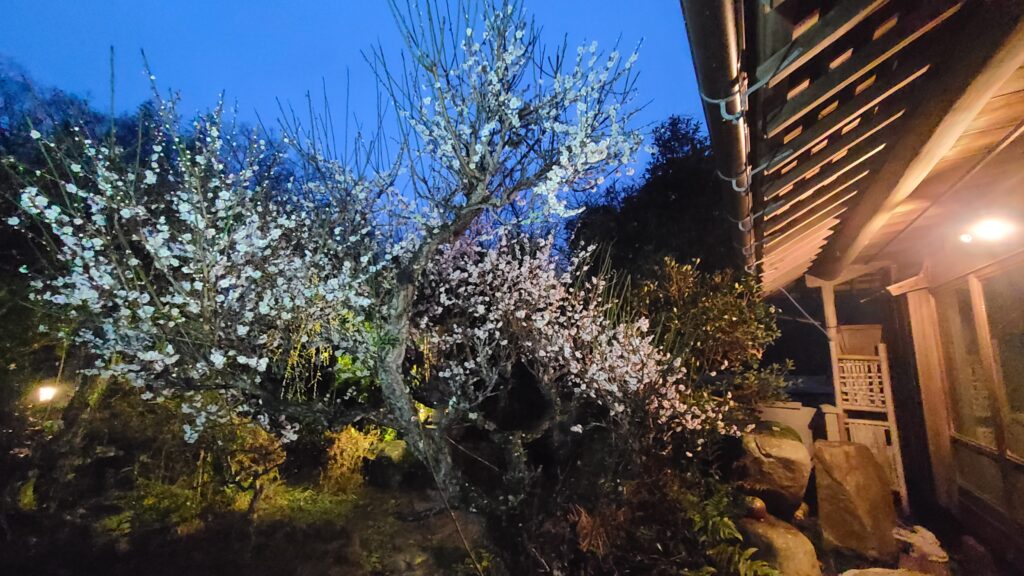 夕方になると、ライトアップされた梅の木が庭園全体を柔らかい光で包み込みます。昼間とは一味違った、夜の梅の美しさに心奪われることでしょう。ライトアップにより浮かび上がる梅の花は、まるで夢の中にいるかのような幻想的な雰囲気を醸し出します。夜にはこの特別な光景を背景に、感動的なコンサートも開催されます。心に染み入る音楽を聴きながら、ライトアップされた梅の花と共に過ごすひとときは、まさに格別です。
