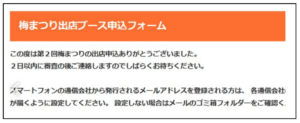 梅まつり出店ブース申込フォーム 2025.11.042026.02.26 必要事項をご記入後「送信」ボタンを押してください。内容を確認後にメールにてご案内します。 姓(必須) 名(必須) ふりがな(必須) 電話番号(必須) LINE ID(LINEグループにご招待します。※既にLINEグループに入っている方は必要ありません。) メールアドレス(必須) 希望種別(必須) 以下より選択してください 飲食(テーブル販売) 飲食(キッチンカー) 健康美容 クラフト物販 占いスピリチュアル アート(音楽/絵画等) 出展ブース写真(正方形👈️長方形で送られた場合上下が削除されますことご了承ください/一辺が1000px以上👈️1000px未満ですとエラーになって承認されません。※写真のピクセル数の確認はこちらのサイトへ)(必須) × 出展ブースタイトル(50文字内で店名やセッション名を記入)(必須) 出展ブースの紹介文章(10~140文字内で紹介文を記入)(必須) どちらからのご紹介ですか? 風鈴屋敷 スコップ ChouChou お友達 2人でブース出展の場合はもう1名のお名前をご記入ください 入力エラーが無い場合は以下のような完了画面に移行されます。 この画面が出ない場合は何らかのエラーがありますので再度ご入力ください。(大抵はブース写真のピクセル数が小さいか、タイトルや紹介文の文字数が多いことがほとんどのエラーです。)